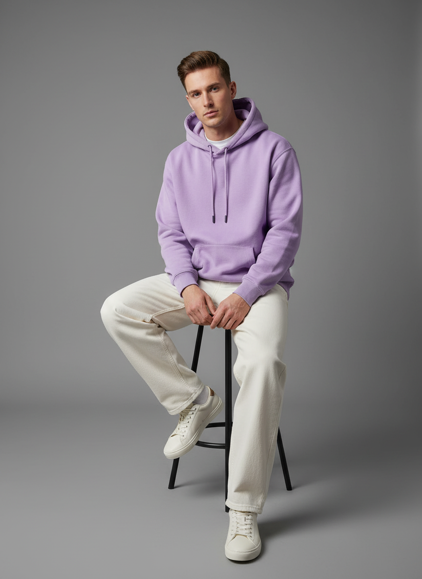 Stay warm and stylish with this Men’s Cotton Fleece Hoodie, crafted from premium-quality cotton fleece for ultimate softness, breathability, and comfort. The relaxed fit ensures easy movement, while the adjustable hood and front kangaroo pocket add functionality to your everyday wear. Its classic Lavender color, long sleeves, and straight hem make it perfect for winter days, gym sessions, or casual outings. Pair it effortlessly with jeans or joggers for a cool, comfortable look.