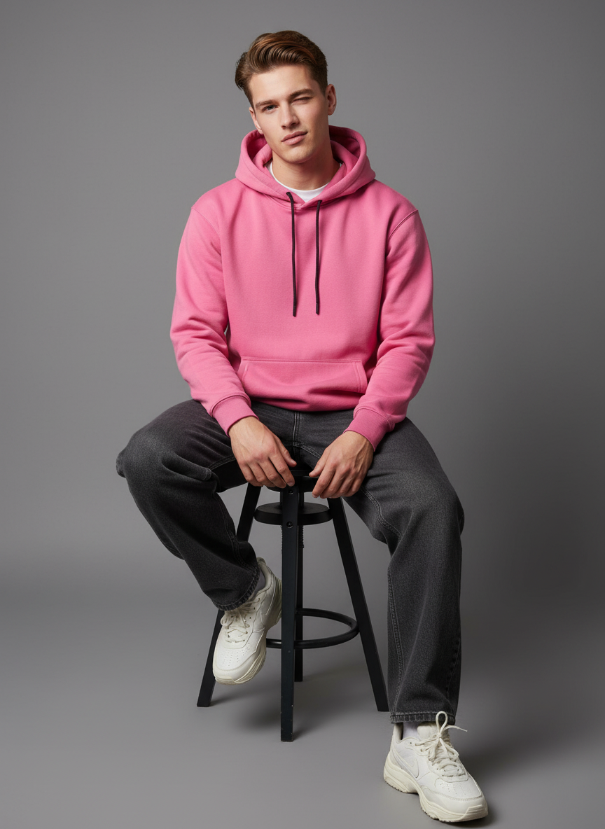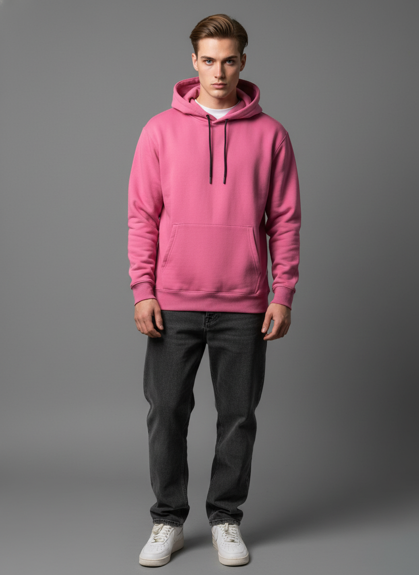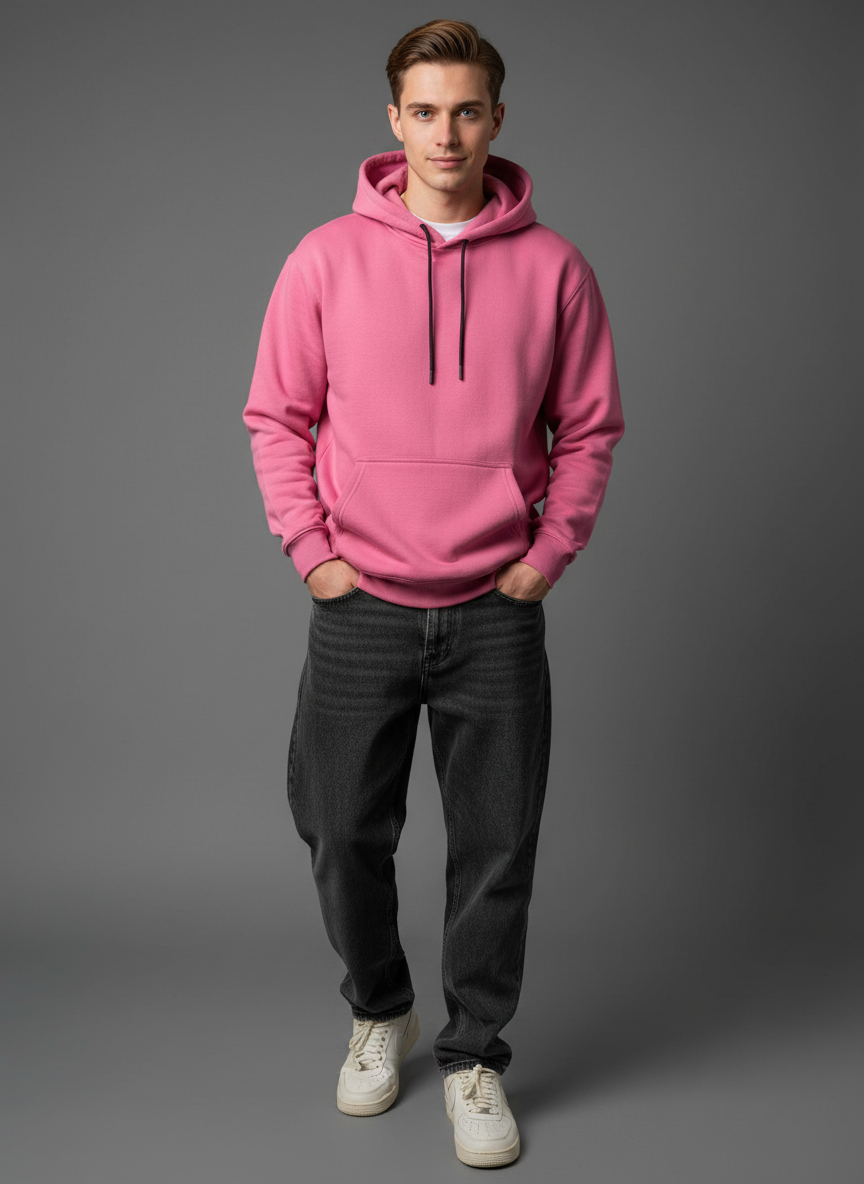 Stay warm and stylish with this Men’s Cotton Fleece Hoodie, crafted from premium-quality cotton fleece for ultimate softness, breathability, and comfort. The relaxed fit ensures easy movement, while the adjustable hood and front kangaroo pocket add functionality to your everyday wear. Its classic Onion Pink color, long sleeves, and straight hem make it perfect for winter days, gym sessions, or casual outings. Pair it effortlessly with jeans or joggers for a cool, comfortable look.
